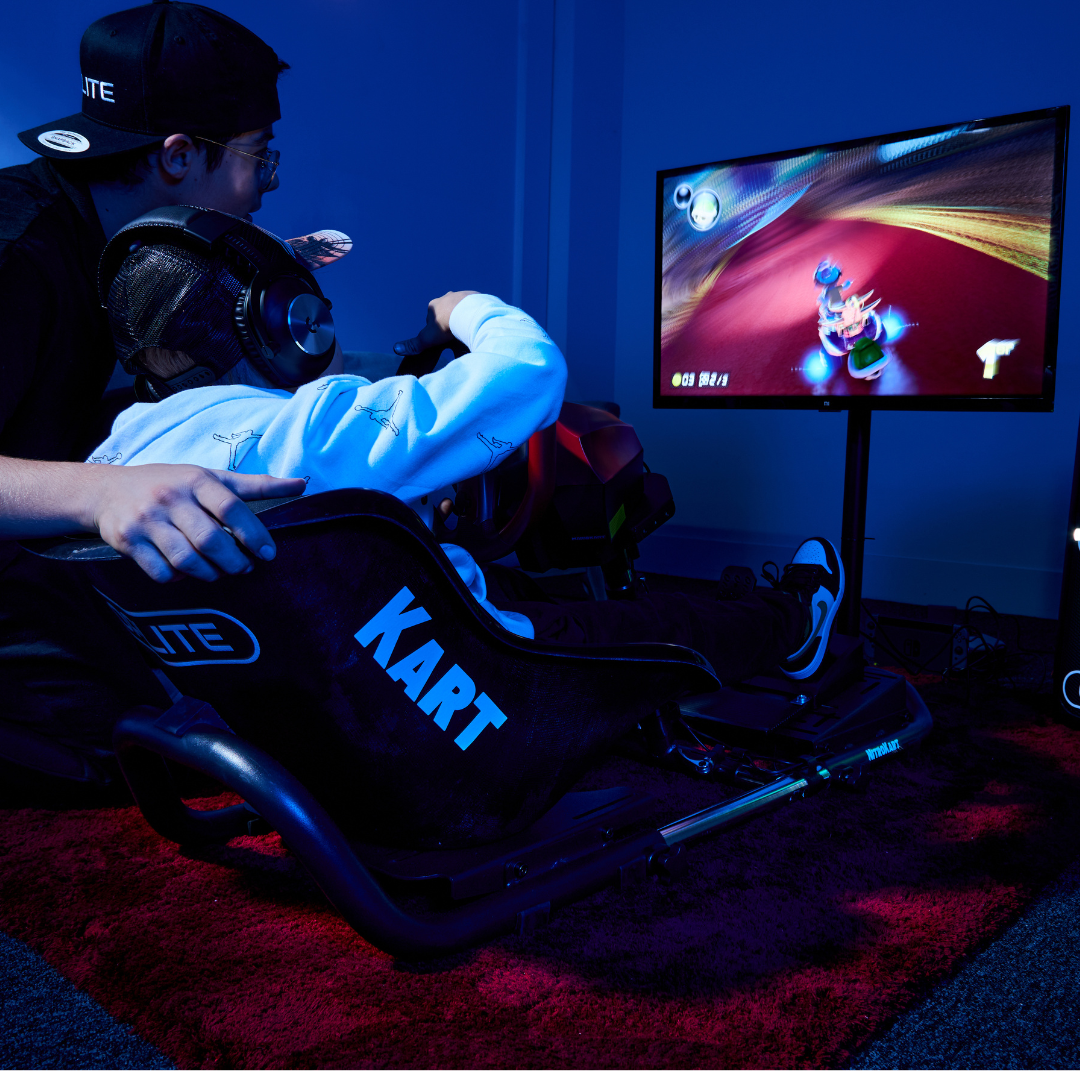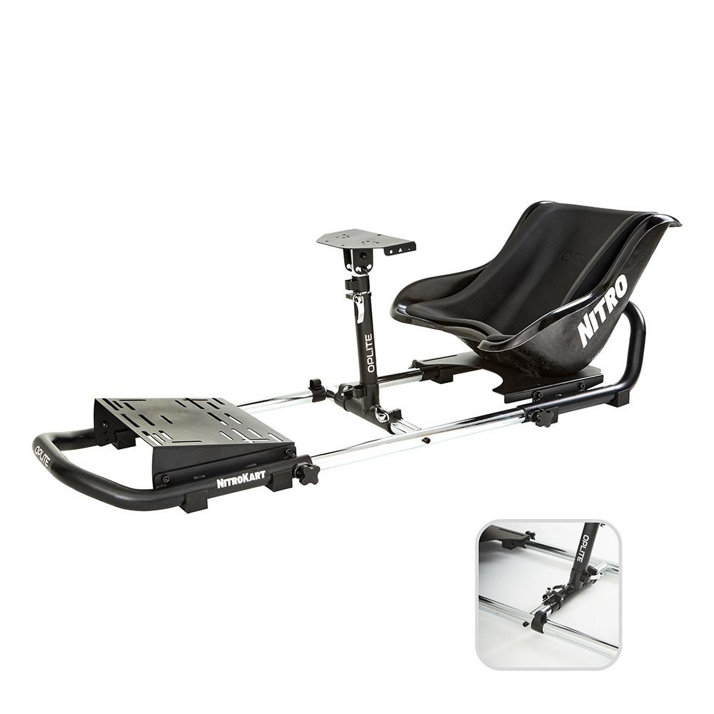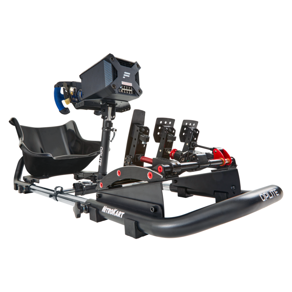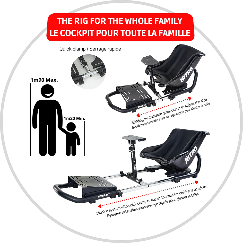 Dotato di un sedile professionale a fondo piatto in fibra di vetro, il NitroKart è progettato per un uso intensivo grazie a materiali di qualità provenienti da vere competizioni di karting. Offre una rigidità esemplare che consente l’uso di un volante Direct Drive e di una combinazione di pedali LoadCell. Compatibile al 100%* con i volanti e i pedali Thrustmaster®, Logitech®, Fanatec®, MOZA® e Hori®, il NitroKart® accompagnerà tutta la famiglia nell’apprendimento della guida sportiva, consentendo di utilizzare volanti e pedali per piloti principianti, avanzati e professionisti.